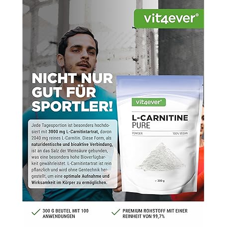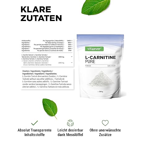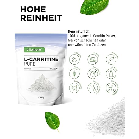 Sản phẩm vit4ever L-Carnitin Pure - 300 g reines Pulver ohne Zusätze - 100% L-Carnitin Tartrat - 100 Portionen mit 3000 mg Carnitinpulver - Vegan - Hochdosiert - Premium Qualität đang được bán với giá ưu đãi là $28.9722 tại nước Đức.