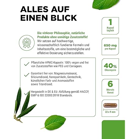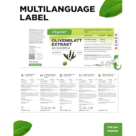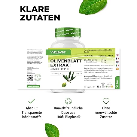 Sản phẩm Vit4ever® Olive Leaf Extract 180 Capsules each with 650 mg – Olive Leaf Extract with 20% Oleuropein = 130 mg Laboratory Tested – High Dosage – Vegan – Premium Quality đang được bán với giá ưu đãi là $21.582 tại nước Đức.