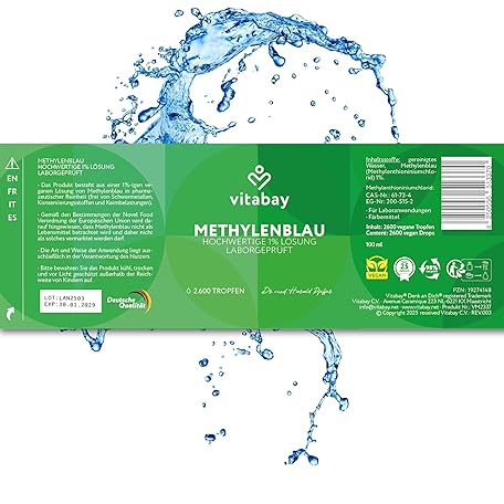 Sản phẩm Vitabay Methylene Blue Solution 100 ml with 99.8% Purity - Methylene Blue Liquid Developed for Research and Analysis Purposes - Laboratory Tested in Germany đang được bán với giá ưu đãi là $21.582 tại nước Đức.