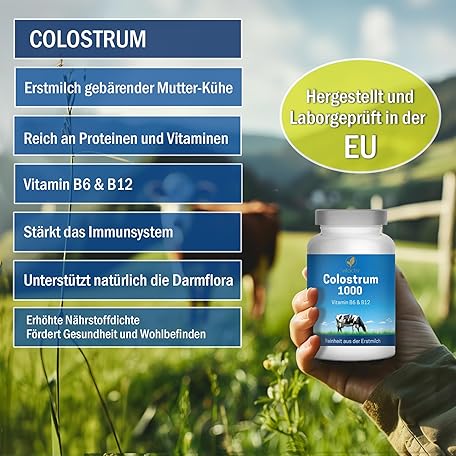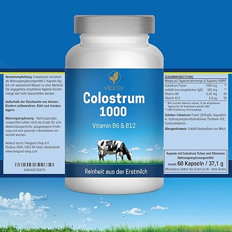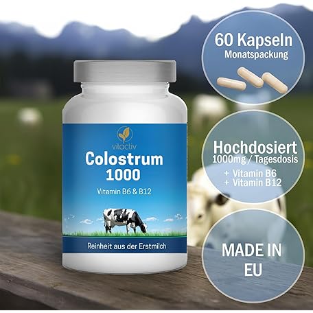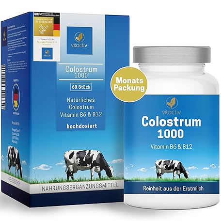 Sản phẩm VITACTIV Colostrum 1000 mg, Colostrum Kapseln hochdosiert plus Vitamin B6 & B12 zur Unterstützung des Immunsystems, Nervensystems und Energiestoffwechsels, aus Kuh-Erstmilch (60 Kapseln, Monatspack) đang được bán với giá ưu đãi là $26.5633 tại nước Đức.