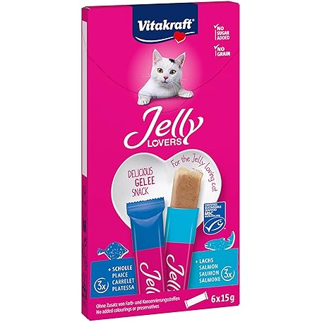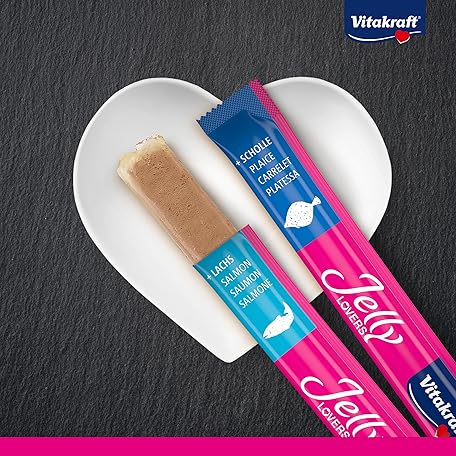 Thông tin sản phẩm Vitakraft Jelly Lovers, Cat Treat, Jelly Cat Snack with Salmon and Plaice, Individual Sticks, No Added Sugar (1 Pack of 6 x 15 g)