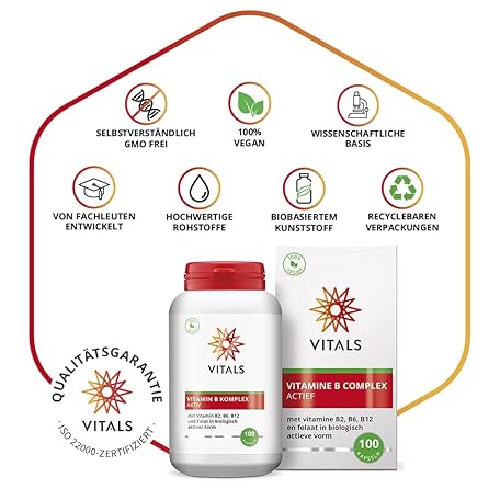 Sản phẩm Vitals - Vitamin B Complex Active 100 Capsules with B1, B2, B3, B5, B6, B12, Biotin, Choline, Inositol, PABA and Folate in Biologically Active Form 100% Vegan đang được bán với giá ưu đãi là $43.9488 tại nước Đức.