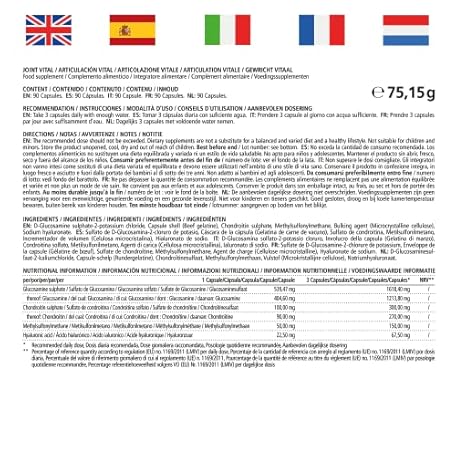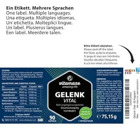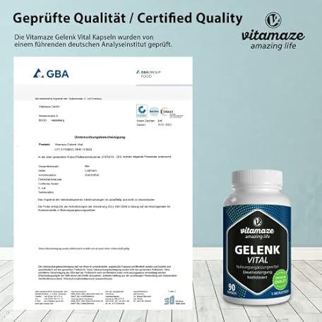 Thông tin sản phẩm Vitamaze Capsules High Dose with Glucosamine + Chondroitin + Hyaluronic Acid + MSM, 90 Capsules as 1 Month Cure, Natural Dietary Supplement without Additives, Made in Germany