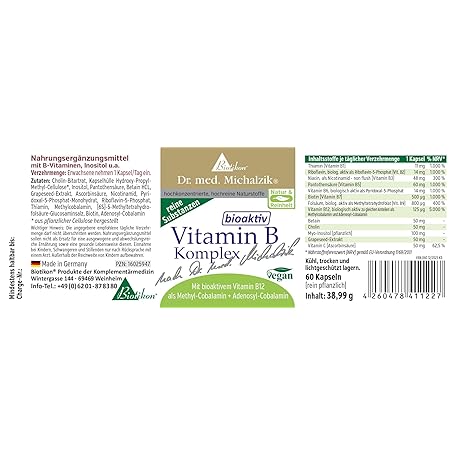 Thông tin sản phẩm Vitamin B Complex, Bioaktiv and Hochdosiert + No Additives + B Vitamins + Betaine + Choline + Inositol and 100% pure vegetable and Gluten Free + Lactosefrei + Gelatinefrei Myo (60 Vegan Capsules