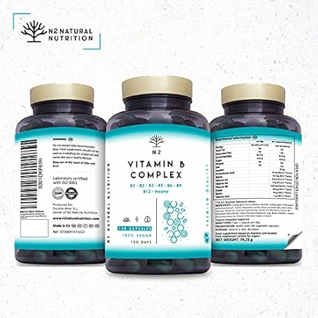 Sản phẩm Vitamin B Complex High Dose. Vitamin B12 B9 (Folic Acid) B7 (Biotin) B6 B3 B2 B1 + Inositol. Contributes to the Reduction of Fatigue and Fatigue. 150 Capsules. Vegan. EU N2 Natural Nutrition đang được bán với giá ưu đãi là $22.7919 tại nước Đức.