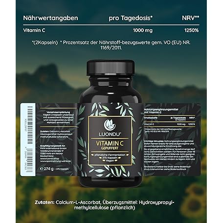 Sản phẩm Vitamin C 375 Capsules Buffered 1000 mg per Daily Dose High Dose Vegan Buffered Vitamin C from Vegetable Fermentation Made in Germany Luondu® đang được bán với giá ưu đãi là $21.7455 tại nước Đức.