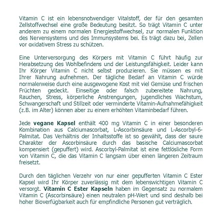 Sản phẩm Vitamin C Ester Buffered 400 mg per Vegan Capsules Pack of 120 for a Stomach-Friendly Supply with Vitamin C đang được bán với giá ưu đãi là $32.2422 tại nước Đức.