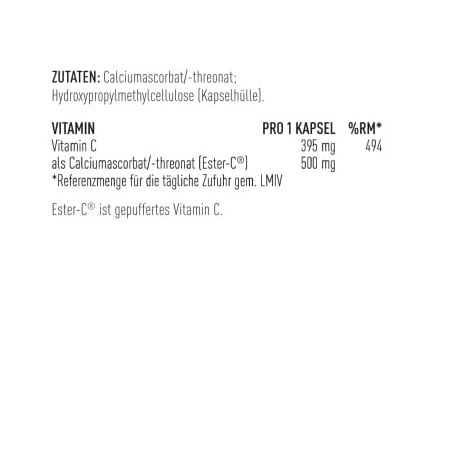 Thông tin sản phẩm Vitamin C Ester-C buffered – in glass, without plasma maker – per capsule 395 mg elementary vitamin C – without magnesium stearate – vegan and high dosage – 110 capsules – German premium quality.