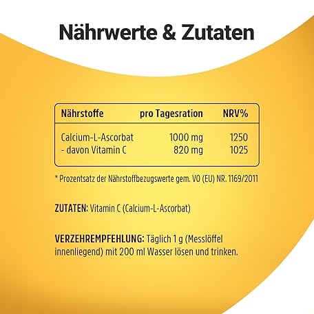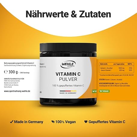 Sản phẩm Vitamin C Powder High Dose 1000 mg Calcium Ascorbate of which 820 mg Vitamin C per g from Vegetable Fermentation & Buffered 300 Poritions, No Additives, Vegan đang được bán với giá ưu đãi là $10.8782 tại nước Đức.