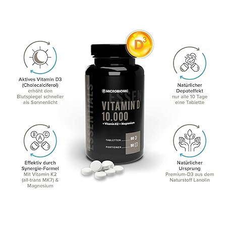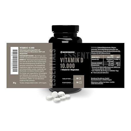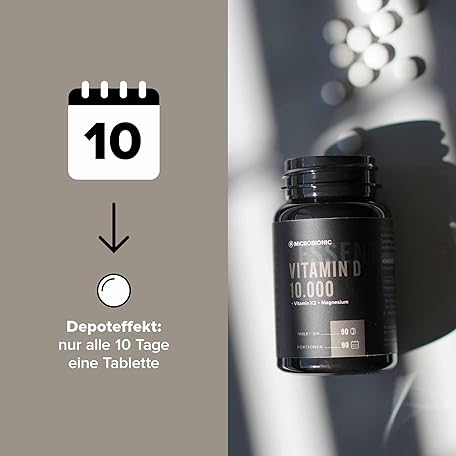 Sản phẩm Vitamin D3 10,000 IU + K2 + Magnesium by MICROBIONIC | 90 Tablets - 1 Tablet Every 10 Days | D3 High Dose & Laboratory Tested đang được bán với giá ưu đãi là $21.5493 tại nước Đức.