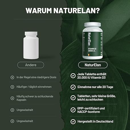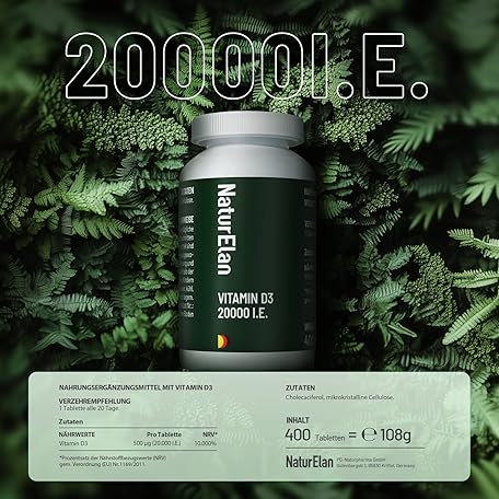Thương hiệu NaturElan là cái tên nổi tiếng được rất nhiều khách hàng trên thế giới chọn lựa. Với kiểu dáng đẹp mắt, sang trọng, sản phẩm Vitamin D3 20000 I.E. Hochdosiert – 400 Tabletten im Jahresvorrat, Sonnenvitamin für Immunsystem, Vegetarisch, In Deutschland Produziert là sự lựa chọn hoàn hảo nếu bạn đang tìm mua một món cho riêng mình.