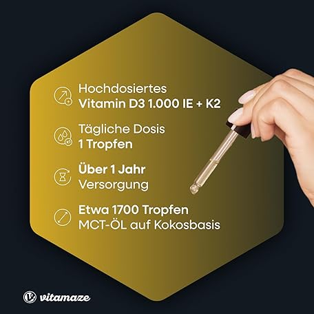 Thương hiệu Vitamaze - amazing life là cái tên nổi tiếng được rất nhiều khách hàng trên thế giới chọn lựa. Với kiểu dáng đẹp mắt, sang trọng, sản phẩm Vitamin D3 + K2 drops, highly dosed and vegetarian, 50 ml (1700 drops), 1000 IU vitamin D3 + K2 liquid, more than 99.7% All-Trans MK-7, without unnecessary additives, made in Germany là sự lựa chọn hoàn hảo nếu bạn đang tìm mua một món cho riêng mình.