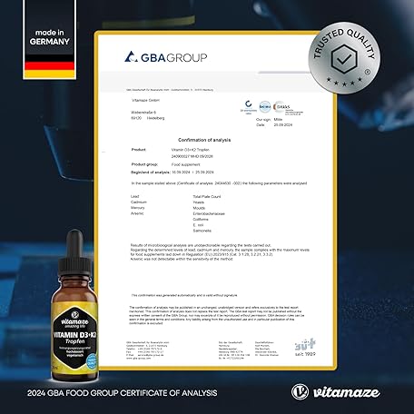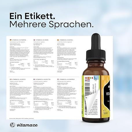 Thông tin sản phẩm Vitamin D3 + K2 drops, highly dosed and vegetarian, 50 ml (1700 drops), 1000 IU vitamin D3 + K2 liquid, more than 99.7% All-Trans MK-7, without unnecessary additives, made in Germany