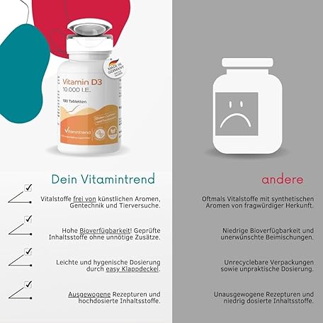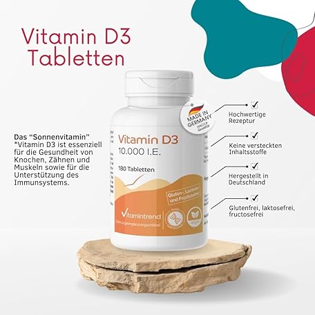 Thương hiệu Vitamintrend là cái tên nổi tiếng được rất nhiều khách hàng trên thế giới chọn lựa. Với kiểu dáng đẹp mắt, sang trọng, sản phẩm Vitamintrend Vitamin D3 10000 IU, 180 Tablets, High Dose, Sun Vitamin Cholecalciferol, Dietary Supplement without Magnesium Stearate, Made in Germany là sự lựa chọn hoàn hảo nếu bạn đang tìm mua một món cho riêng mình.