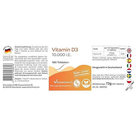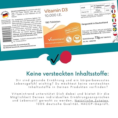 Thông tin sản phẩm Vitamintrend Vitamin D3 10000 IU, 180 Tablets, High Dose, Sun Vitamin Cholecalciferol, Dietary Supplement without Magnesium Stearate, Made in Germany
