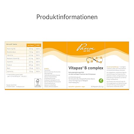 Thông tin sản phẩm Vitapas B Complex: Vitamin B Complex with All 8 Important B Vitamins (B1, B2, B3, B5, B6, B12), Biotin & Folic Acid - Energy & Strong Nerves - Vegan, Lactose & Gluten Free - 60 Capsules