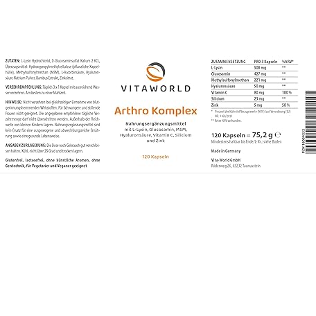 Sản phẩm vitaworld Arthro Complex - Vegan Joint Complex with Glucosamine, MSM, Hyaluronic Acid, L-Lysine, Vitamin C, Zinc & Silicon from Bamboo - 120 Capsules - No Crustaceans đang được bán với giá ưu đãi là $22.672 tại nước Đức.
