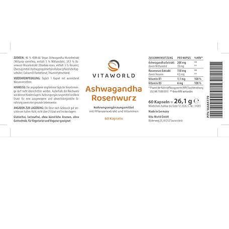 Thông tin sản phẩm vitaworld Ashwagandha Rosenwurz Komplex, Premium KSM-66® Extrakt, 10 mg Withanolid und 4,5 mg Rosavin pro Kapsel, Vegan, 60 Kapseln