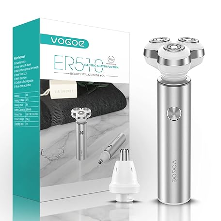 VOGOE Men's Electric Razor, Wireless Shaver, Rechargeable, Men's Shaver, Electric Rotary Shaving with Nose Trimmer, Wet/Dry Use, Silver ER510