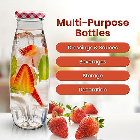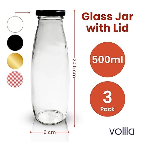 Thông tin sản phẩm volila Glass Milk Bottles with Lids - 3 Pack x 500ml Glass Bottles with Lids, Labels and Pen - Reusable Milk Bottle for Juices, Decoration and Storage (Black Lid)