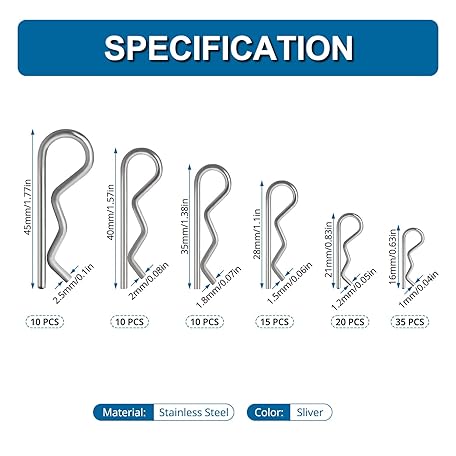 Thông tin sản phẩm VooGenzek 100 Pieces 6 Sizes Stainless Steel Cotter Pin Kit, R Clips Retaining Pins, Spring Pins for Automotive, Mechanics, Car Workshop, Workshop