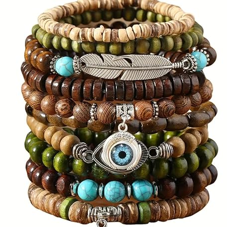 ware-direkt Wooden Beads Bracelet Set - 10 Pieces - Boho Jewellery Unisex - Elastic - Women Men - Natural Look - Festival Accessory - Ethnic Style - Gift Idea