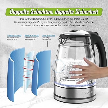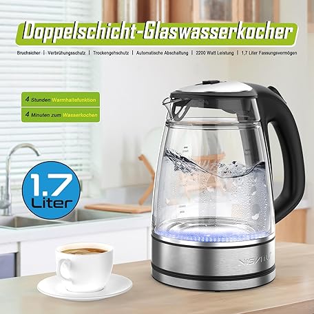 Thông tin sản phẩm Wasserkocher Doppelwandig Glas 1,7L Ohne Plastik Mit Kalkfilter Heißwasserspender Kleiner BPA-Frei Leise Edelstahl Warmhaltefunktion Kabellos Groß Still LED Heater, Automatische Abschaltung Schwarz