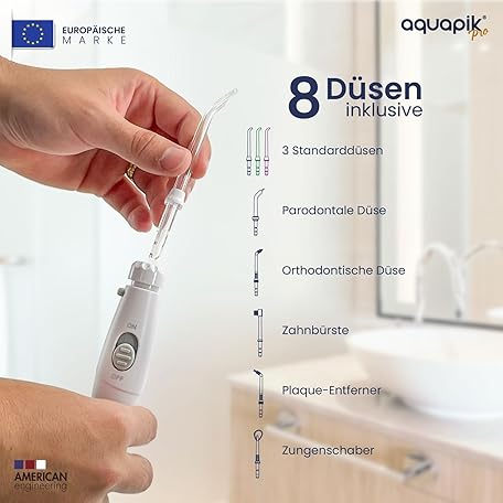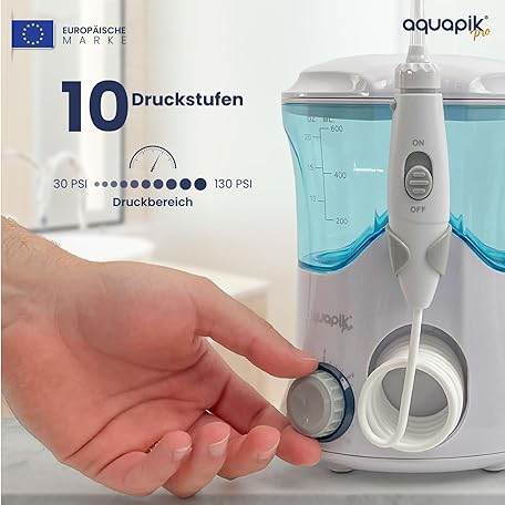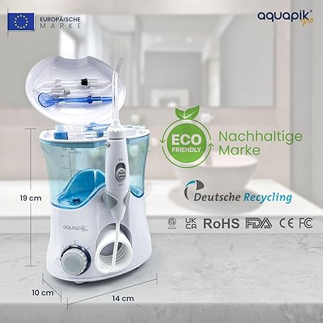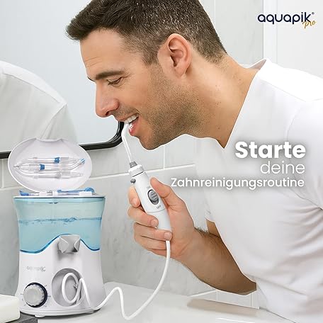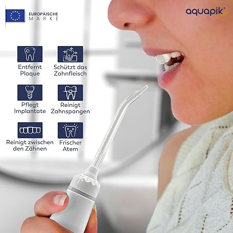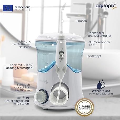 Sản phẩm Water Flosser Oral Irrigator PRO | Aquapik® Professional Teeth Cleaning, Removes Plaque, Recommended by Dentists, for Implants & Braces | 8 Nozzles, 10 Pressure Levels, 600 ml (White) đang được bán với giá ưu đãi là $61.9665 tại nước Đức.