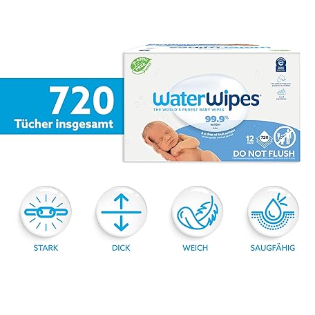 Sản phẩm WaterWipes Plastic-Free Original Baby Wipes, 720 Wipes (12 Packs), 99.9% Water-Based Cleaning Wipes, Unscented for Sensitive Skin đang được bán với giá ưu đãi là $39.894 tại nước Đức.