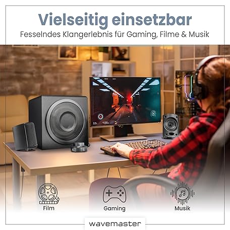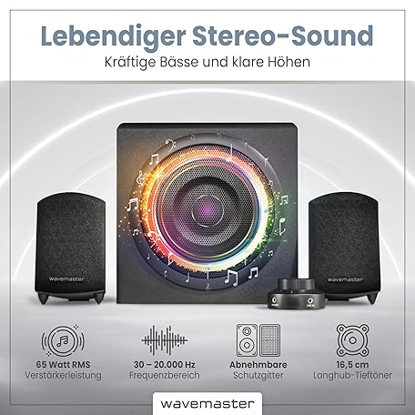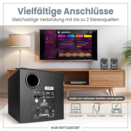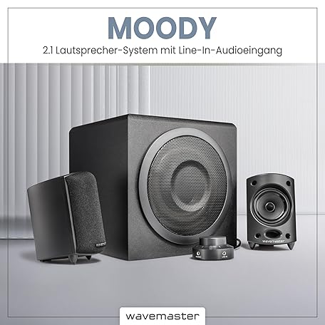 Sản phẩm Wavemaster Moody 66202 2.1 Speaker System (65 Watt) Active Boxes Use for TV / Tablet / Smartphone / PC Black đang được bán với giá ưu đãi là $89.4454 tại nước Đức.