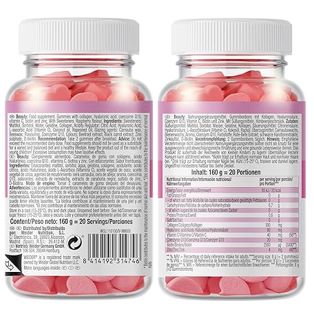 Thông tin sản phẩm WEIDER Beauty Gummies, vitamin gummy bears for skin, hair and nails, with biotin, collagen hyaluronic acid and coenzyme Q10, delicious fruit gummies, highly dosed, sugar-free, raspberry flavour.