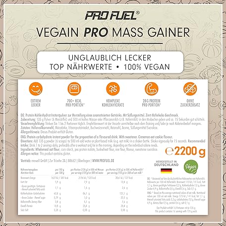 Thông tin sản phẩm Weight Gainer Cinnamon Oat Cookie, 2.2 kg Mass Gainer, 100% Vegan, Complex Carbohydrates + Vegan Protein, Ideal for Muscle Building, Very Delicious, No Soy or Maltodextrin, Made in Germany