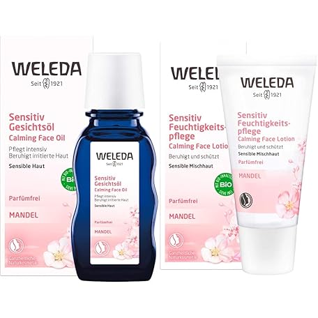 WELEDA Organic Almond Sensitive Face Oil, Intensive Natural Cosmetics Organic Care Oil Against Blemished Skin, Skin Irritations and Makeup Removal (1 x 50 ml) & Organic Almond Sensitive Moisturiser (1