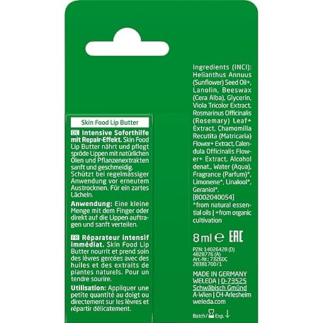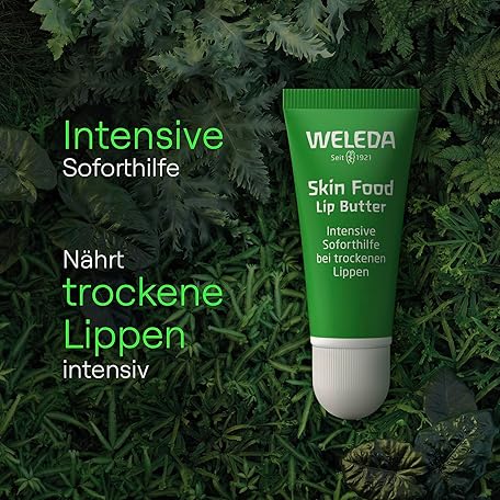 Thông tin sản phẩm WELEDA Organic Skin Food Lip Butter Lip Care - Natural Cosmetics Care Lip Balm Instant Aid for Brittle & Dry Lips. Sustainable Lipstick with Beeswax, Lanolin & Sunflower Oil (1 x 8 ml)