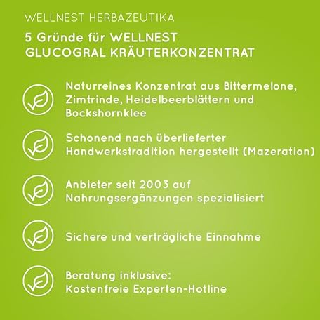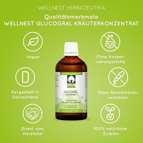 Sản phẩm Wellnest GlucoGral Herbal Concentrate 100 ml | No Artificial Colours or Flavours - Vegetable and Vegan | with Bitter Melon and Cinnamon Bark đang được bán với giá ưu đãi là $39.0002 tại nước Đức.