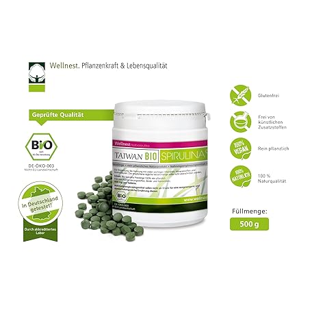 Sản phẩm Wellnest Organic Taiwan Spirulina Detox Superfood with High-Quality Protein Blue Algae Vegan 1250 Pellets of 400 mg đang được bán với giá ưu đãi là $75.3299 tại nước Đức.