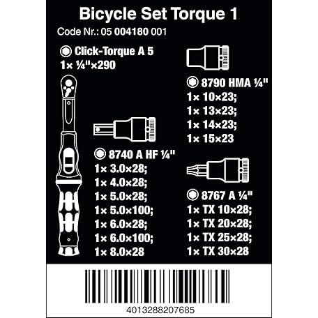 Thông tin sản phẩm Wera 05004180001 Bicycle Set Torque 1 Bicycle Torque Wrench Set, Black, 16 Pieces & 8796 SA Cyclop Extension Flexible Lock with Quick-Turn Sleeve, Short, 1/4 Inch, 05003530001