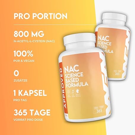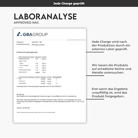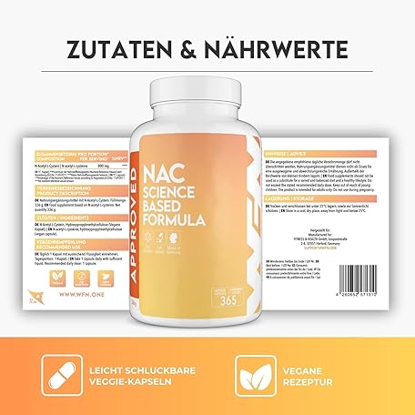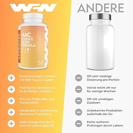 Thông tin sản phẩm WFN Approved NAC 800 mg per capsule - 365 capsules annual supply - high dose, vegan, no additives - produced and laboratory tested in Germany