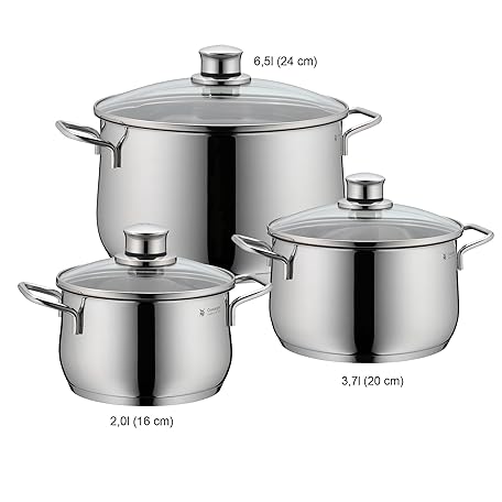 Sản phẩm WMF Diadem Plus Topfset Induktion 3-teilig, Kochtopf Set mit Glasdeckel, Cromargan Edelstahl poliert, Induktions Töpfe Set unbeschichtet đang được bán với giá ưu đãi là $130.6038 tại nước Đức.