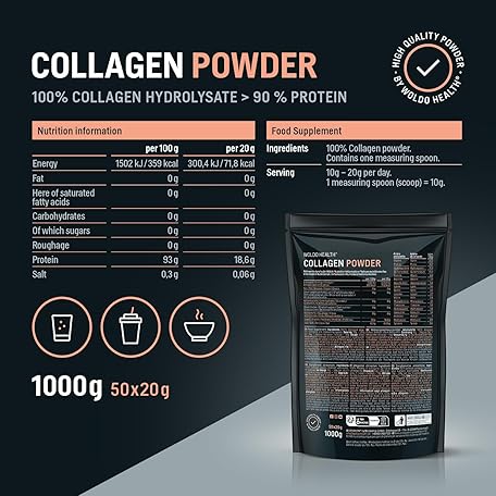 Thông tin sản phẩm WoldoHealth Collagen, 100% Protein, Pure Hydrolysate Collagen Powder, 500 g, Tasteless, Easily Soluble, Bovine Based 1000 g
