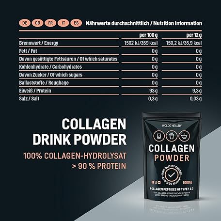 Sản phẩm WoldoHealth Collagen, 100% Protein, Pure Hydrolysate Collagen Powder, 500 g, Tasteless, Easily Soluble, Bovine Based 1000 g đang được bán với giá ưu đãi là $42.3029 tại nước Đức.