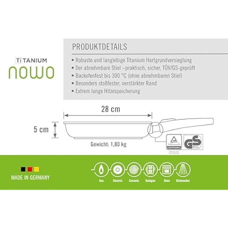 Thông tin sản phẩm Woll Nowo Titanium Flachpfanne, Ø 28 cm, 5 cm hoch, mit abnehmbarem Stiel - Geeignet für Ceran, Gas, Elektro, Halogen - nicht induktionsgeeignet, Aluminiumguss, Antihaft-Versiegelung
