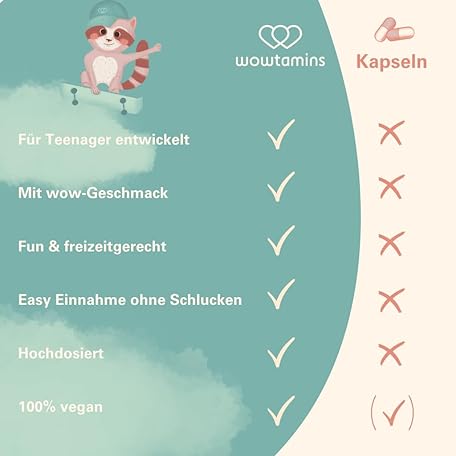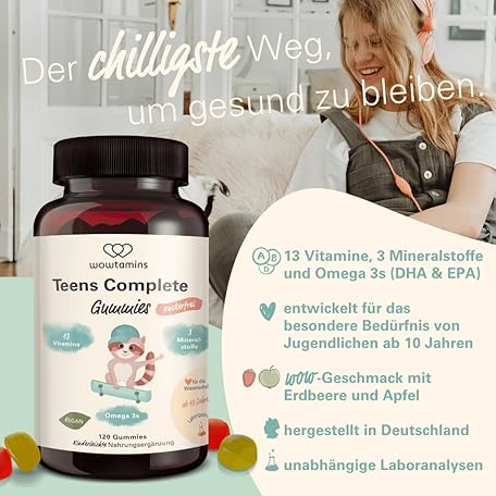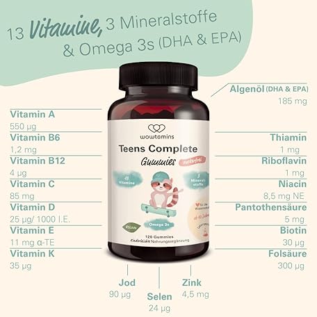 Thông tin sản phẩm wowtamins Teens Complete zuckerfrei - Vitamine für Jugendliche (30-Tage-Vorrat) - Multivitamin Gummies mit Omega 3 - Nahrungsergänzungsmittel für das Immunsystem mit Vitamin C, D3, B12, Zink & mehr