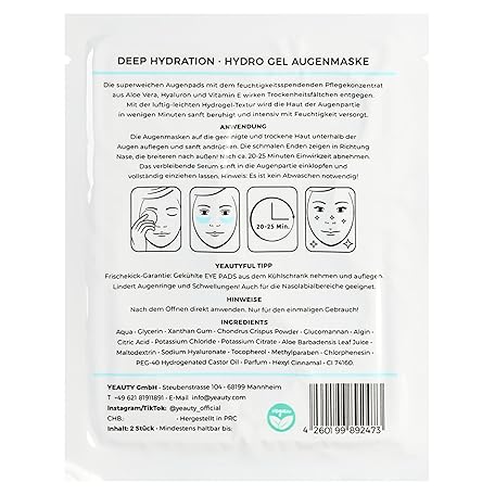 Sản phẩm YEAUTY Deep hydration eye pad mask, moisturising eye pads with aloe vera, hyaluronic and vitamin E against dry and brittle skin, for an optimally moisturised eye area đang được bán với giá ưu đãi là $1.1118 tại nước Đức.