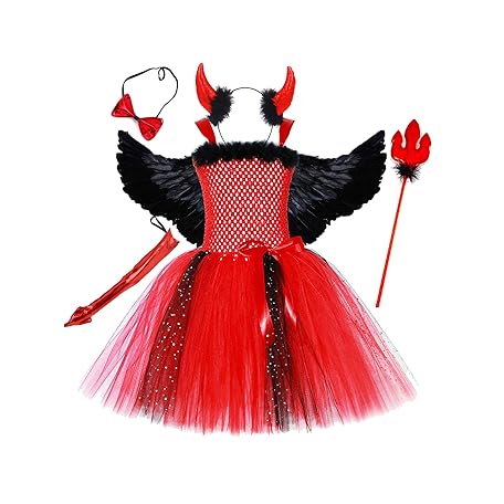 Yruioon 6tlg.Kinder Mädchen Engel Teufel Kleid + Engelsflügel Stirnband Schwanz + Dreizack Fee Outfit Halloween Weihnachten Karneval Rot 140-152