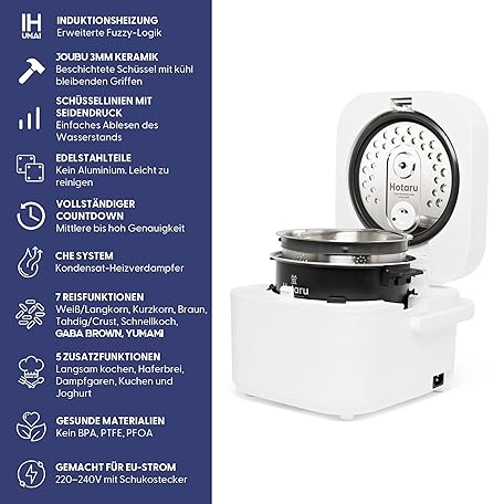 Thông tin sản phẩm Yum Asia Hotaru Rice Cooker with UMAI Induction Heater (IH) and Ceramic Bowl (3 Cups, 0.54 Litres), 7 Rice Cooking Functions, 5 Multi-Cooker Functions, LED Display, 220-240 V EU Plug (Ice White)