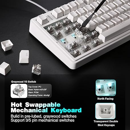 Thông tin sản phẩm YUNZII B75 Gasket Mechanical Keyboard, 75% 80Keys Wired Gaming Keyboard with Button, Hot Swappable Mechanical Keyboard with Translucent Keycaps for Win/MAC/Android (Graywood Switch, White)