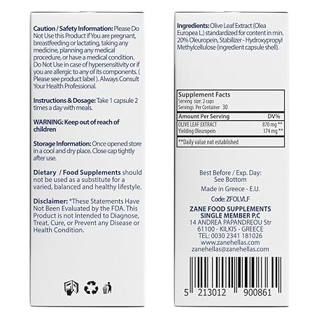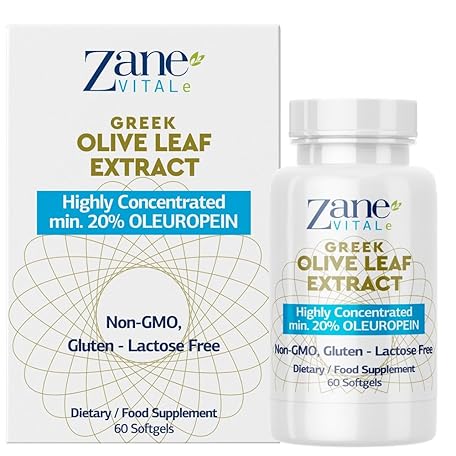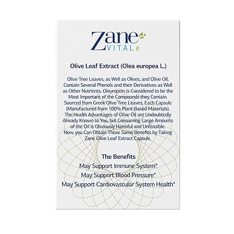 Thông tin sản phẩm Zane Greek Olive Leaf Extract, Min. 20% Oleuropein, Provides Support for the Immune System and Healthy Blood Pressure, Promotes Cardiovascular System Health, GMO-free, Gluten.
