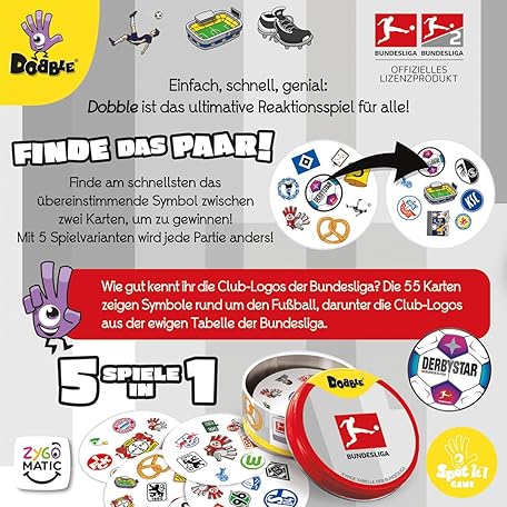 Thông tin sản phẩm Zygomatic, Dobble Bundesliga, Familienspiel, Kartenspiel, 2-8 Spieler, Ab 6+ Jahren, 15 Minuten, Deutsch
