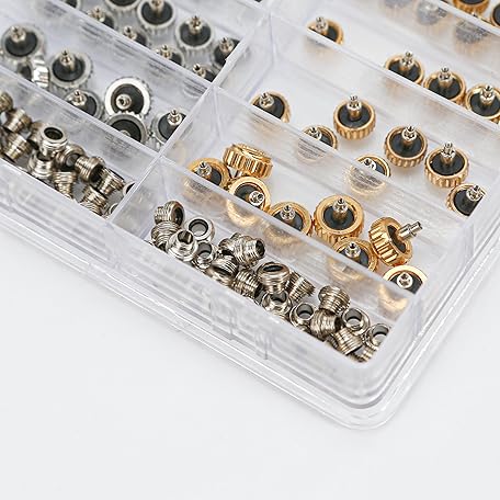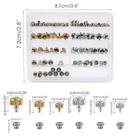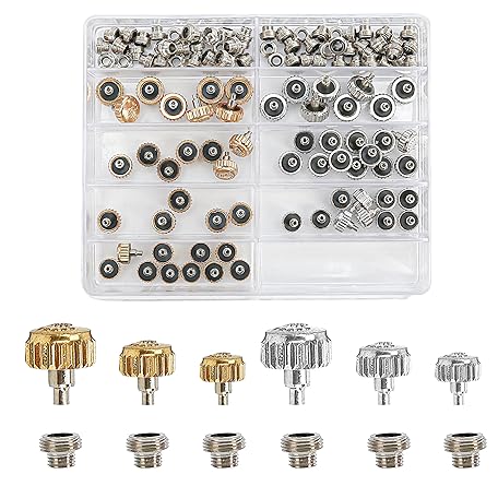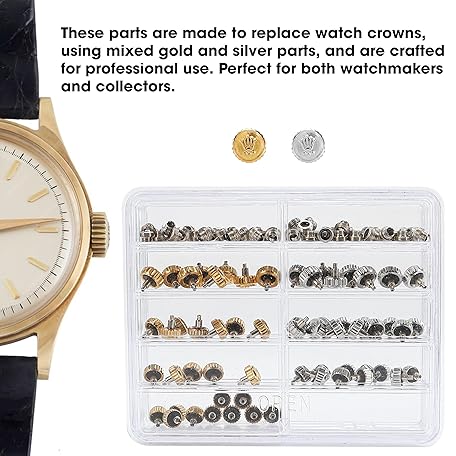 腕時計クラウン交換用腕時計120個。Rolex Calibre 3135 3235 3335に対応。防水ダウンスクリュー銅ブロンズリンクアクセサリー詰め合わせパーツキット、スペア修理取り外しツール(シルバーゴールドアソート)。, ゴールド, モダン